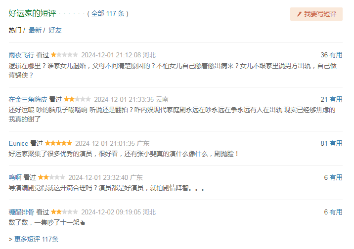 因为槽点太多,电视剧在豆瓣口碑扑的很惨烈,首页无意高傲的5条热评,有四条都是差评。有网友奏凯点出剧情分歧逻辑之处“逻辑在那边?谁家女儿退婚,父母不问清亮原因的?不怕女儿我方憋着憋出病来?女儿不跟家里说男方出轨,我方作念背锅侠?”还有网友吐槽“吵的脑瓜子嗡嗡响,试验依然够恐忧了当代家庭剧还始终在吵、始终有东说念主在出轨。”以及有网友数了一下,发现“一集吵了十一架。”